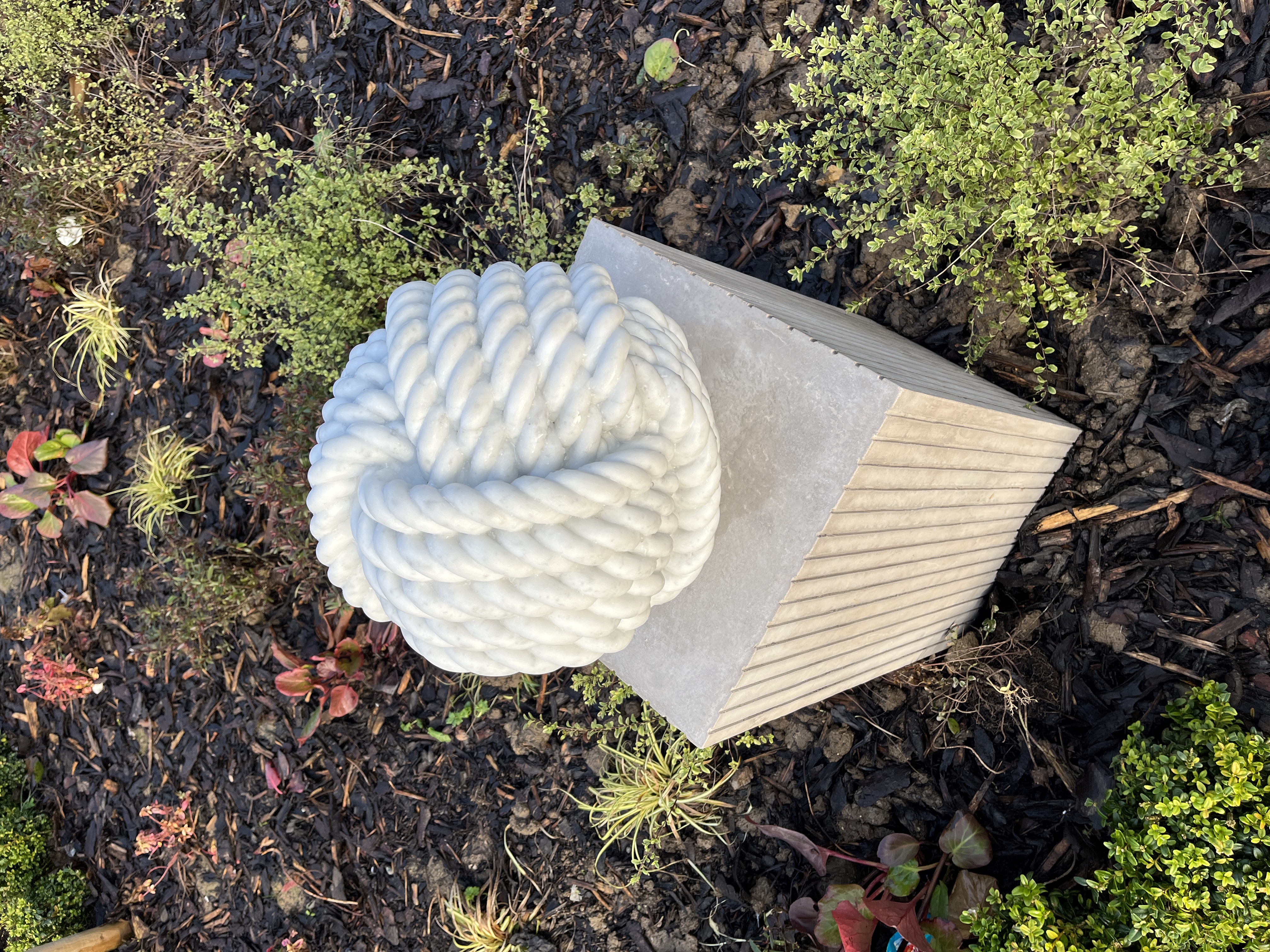 Two 40cm3 Monkey’s Fist Knots sit on concrete plinths in the reimagined town square. Sculpted on a 5-axis CNC machine from Kilkenny Black Fossil Granite and white Carrara Marble.